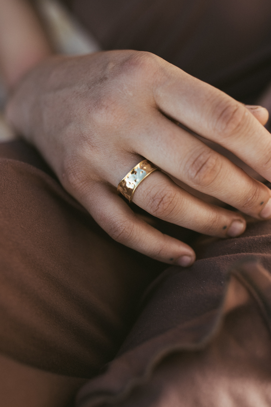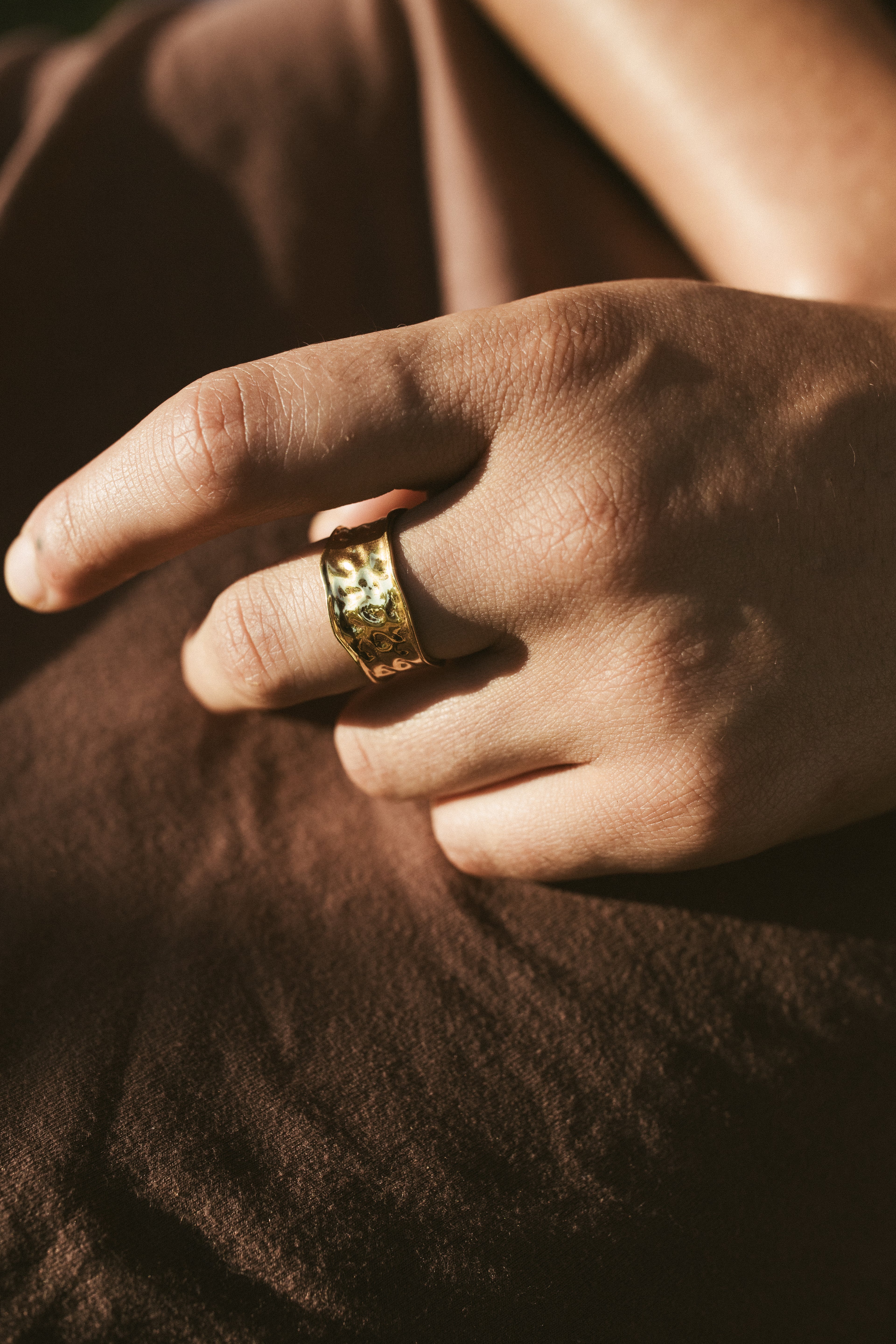 A bold, timeless band ring with a textured, hand-beaten finish. Perfect for stacking or making a statement on its own. Hand-finished for a unique texture.